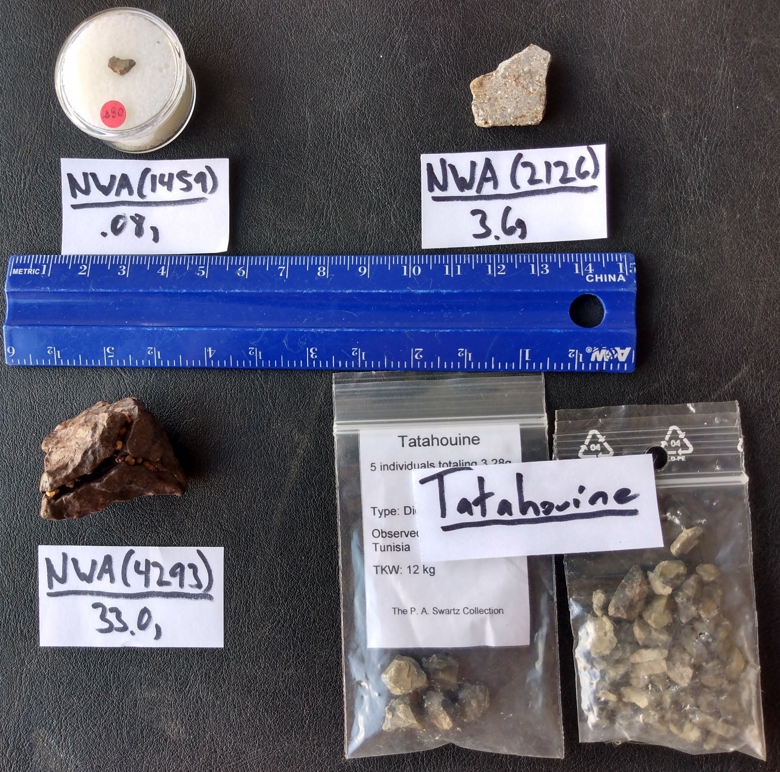 The Meteoritical bulleting says one piece was found. I actually remember when pieces of this (well, likely pairings anyway) first started to come out. Up until then, I think Colony, Oklahoma (and maybe a small piece of Kainsaz) were all I had for CO3 meteorites (and neither was cheap). I ended up buying several of these things, more than doubling my suite of CO3 meteorites in my collection. There were a fair number of these that came out (and it IS likely that many are paired) but I have not seen any of these for a while. This is a natural fragment that has two cut faces roughly perpendicular to each other (so, kind of a “book end” cut). This comes with a Hupe Collection label.
