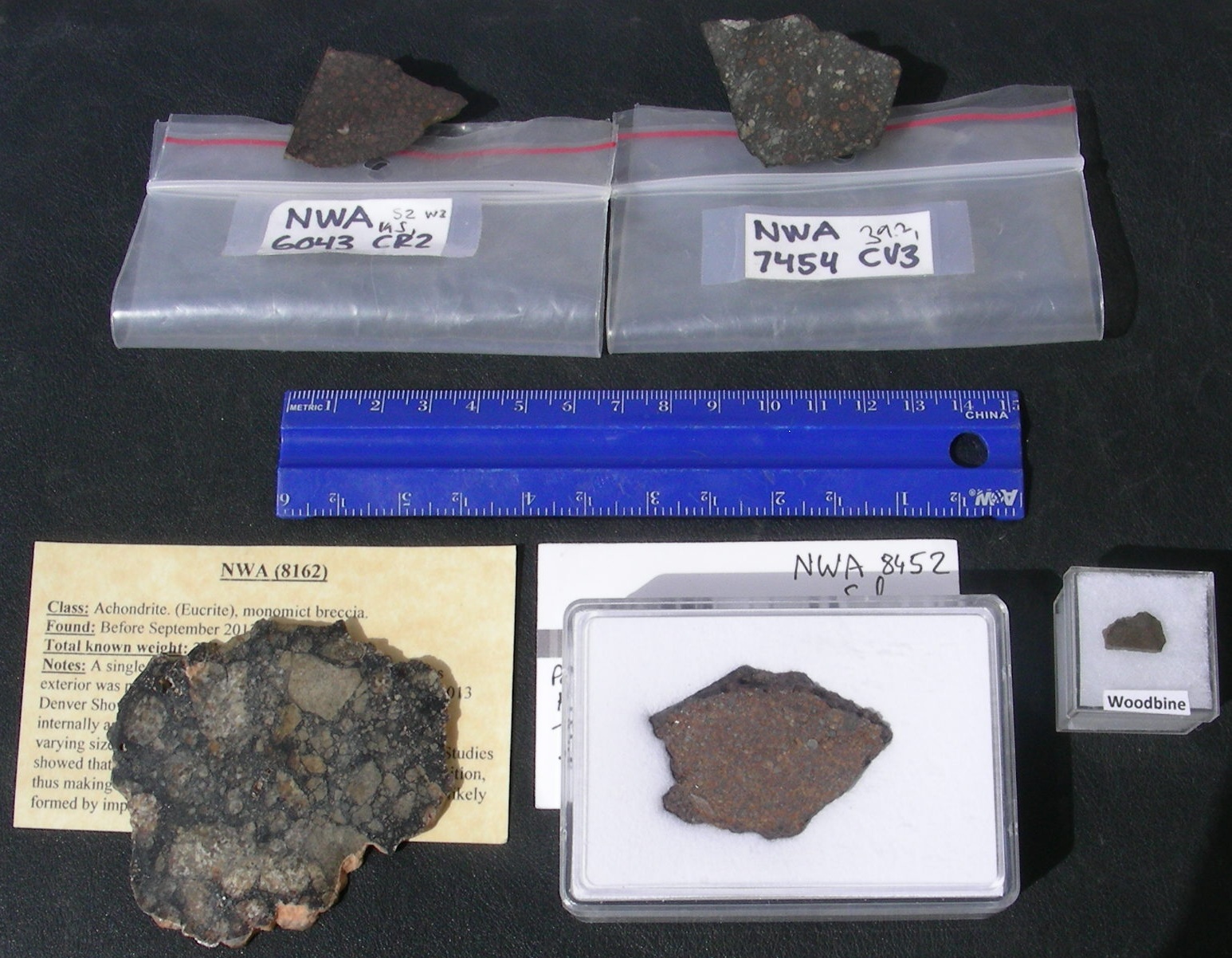 This is the one that hit the back end of a mailbox and knocked it completely off of its post. I actually owned the mailbox for 5 or 6 years until someone made me an offer I “couldn’t refuse”, so I didn’t. I had some nice pieces of this years ago when it was first made available to collectors but have seen very little since. These are from a collector that kind of had a thing for this meteorite and bought up any piece he could find and afford. He has decided to let the extras go. I sold 4 of the largest pieces in Tucson. Oddly, I only sold one of the small ones (it was that “big money” coming to the show thing mentioned above thing I guess). These are all part slices and all are in some sort of display container. All have a label with them. I did manage to get those in the group photo but I will mention what they are after each item listed below.\